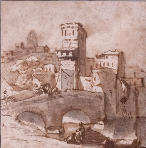Claude Lorrain (attr.), Capriccio con l’isola Tiberina, 1635-1640 ca. Disegno a penna, inchiostro bruno, acquerello su carta bianca montato su carta color malva, 205 x 200 mm. Come già rilevato da Maurizio Marini in un expertise del 6 agosto 2008, il disegno va attribuito al paesaggista francese Claude Gellée, più noto per la sua provenienza geografica come Claude Lorrain o Claudio Lorenese (Chamagne 1600 - Roma 1682) e considerato tra i maggiori rappresentanti del paesaggio classico del Seicento. Eseguito intorno al 1635-1640, come conferma il confronto con altri fogli di quel periodo in cui l’artista ha coniugato con disinvoltura elementi naturalistici ed elementi architettonici, il disegno mostra una sorta di capriccio o di paesaggio ideale in cui sono rappresentate parti dell’isola Tiberina, rovine classiche e medievali, sullo sfondo in alto a sinistra un gruppo di edifici su cui domina un campanile e in primo piano un ponte a doppia arcata attraversato da alcune persone, mentre altre stanno dialogando sulla riva di un fiume presso una barca. Caratterizzato da un suggestivo effetto pittorico dovuto alla grande perizia del pittore nelle lumeggiature, il disegno testimonia la straordinaria statura di Lorrain anche nel campo della grafica.