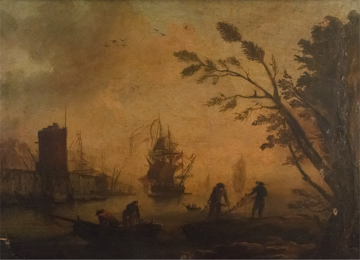Thomas Wyck (attr.), metà XVII secolo Coppia di paesaggi con porto.Olio su tela, 60 x 76 cm (ciascuno). I pendants raffiguranti due marine con porto sono da attribuire all’olandese Thomas Wyck (1621 ca.-1677), attivo ad Haarlem e particolarmente abile nella resa di paesaggi marini di ispirazione mediterranea (si confrontino i due dipinti in esame con il Paesaggio con porto di Wyck alla Gemäldegalerie der Akademie der bildenden Künste di Vienna). Uno dei due paesaggi mostra un caratteristico veliero olandese del XVII secolo, il cosiddetto fluyt, il che contribuisce a rafforzare l’attribuzione delle opere al maestro nordico.