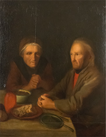 Scuola olandese, metà XVII secolo Coppia in preghiera prima del pasto. Olio su tavola, 46,5 x 36 cm. Databile alla metà del Seicento, la tavola illustra una coppia di anziani in preghiera prima di consumare un pasto frugale. Dal punto di vista formale, tanto per il taglio compositivo della scena quanto per il suggestivo effetto luministico, il quadro mostra le caratteristiche della scuola di Rembrandt, come del resto testimoniano indirettamente l’uso della tavola come supporto e il formato ridotto.