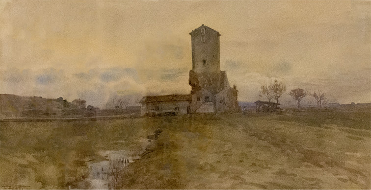 Filippo Anivitti ( Roma 1876 – 1955 ), Torre Salaria. Acquarello su carta di cm 34 x 65 firmato in basso a sinistra.