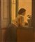 Giuseppe Ar ( Lucera 1898 – Napoli 1956 ), L’attesa. Olio su tela di cm 66 x 55 firmato e datato 1939 in basso a destra. “Ar non è pittore di effetti: è pittore che penetra il cuore. La sua arte, semplice, chiara, armoniosa, controllata, appartiene più che al tempo ai tempi. Quando si parla del suo valore tecnico non si dice tutto di lui, e non si dice il meglio. Ar ha quello che è supremazia dello spirito: il senso della poesia. Una poesia senza letteratura, senza rimario: una poesia che pervade le cose morte e le anima, che illumina di una purità splendente l’umile vita…” ( Guido Guida, 1952 ). Anche nel dipinto qui presentato, la delicata tavolozza di Giuseppe Ar trova il suo noumeno nella luce che il pittore cattura direttamente dai cieli chiari di una calda e abbacinate Lucera, sua città natale e autentico luogo dell’anima: nella giovane donna affacciata alla finestra – motivo iconografico ricorrente nella produzione dell’artista pugliese – il tratto si coniuga felicemente con la luce del volto, con la profondità degli occhi pieni di impenetrabile mistero e velata malinconia. La sospensione dell’attesa della protagonista viene calata in un ambiente spoglio, giocato tutto sugli accordi cromatici e chiaroscurali, ammantati da un incantamento lirico che attenuando la carica emotiva della scena, ne potenzia l’atmosfera di respiro metafisico.