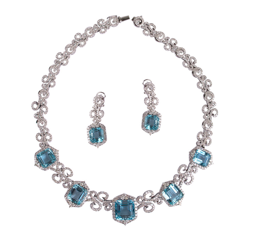Parure collana e orecchini con Acquemarine e brillanti. 7 Acquamarine cti. 60 Brillanti G-H VS cti 20 Oro bianco 18 Kti. Gr. 107