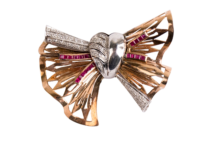 Spilla anni '50 in oro bianco e rubini carré. Oro 18 Kti. Peso complessivo gr.10,50