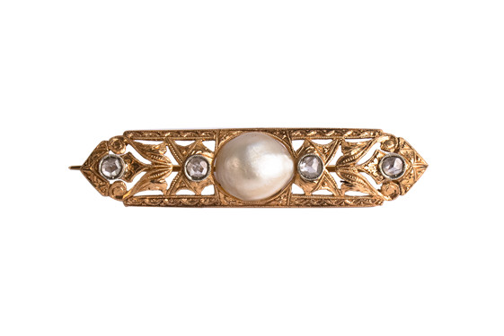 Lotto 60 | Spilla con perla e diamanti Anni '30. Oro 18 Kti. Peso complessivo gr. 6,50
