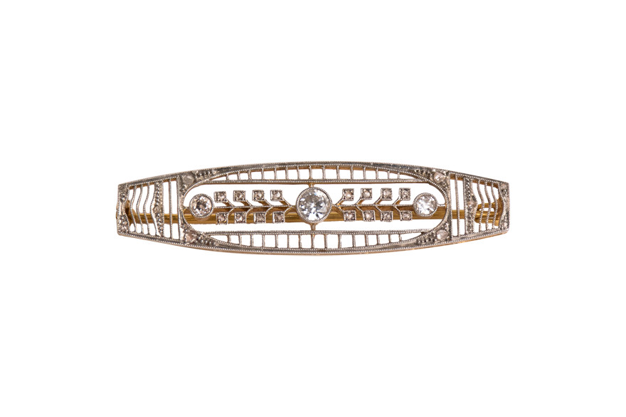 Spilla deco oro e oroe oro bianco con diamanti. Peso gr. 6,30