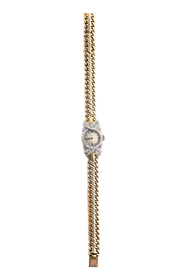 Orologio Cartier Vintage. Cassa: in oro giallo con lunetta a doppia fila di brillanti. Quadrante: argentee numeri romani. Movimento: a carica manuale.Bracciale: in oro giallo 18KT
