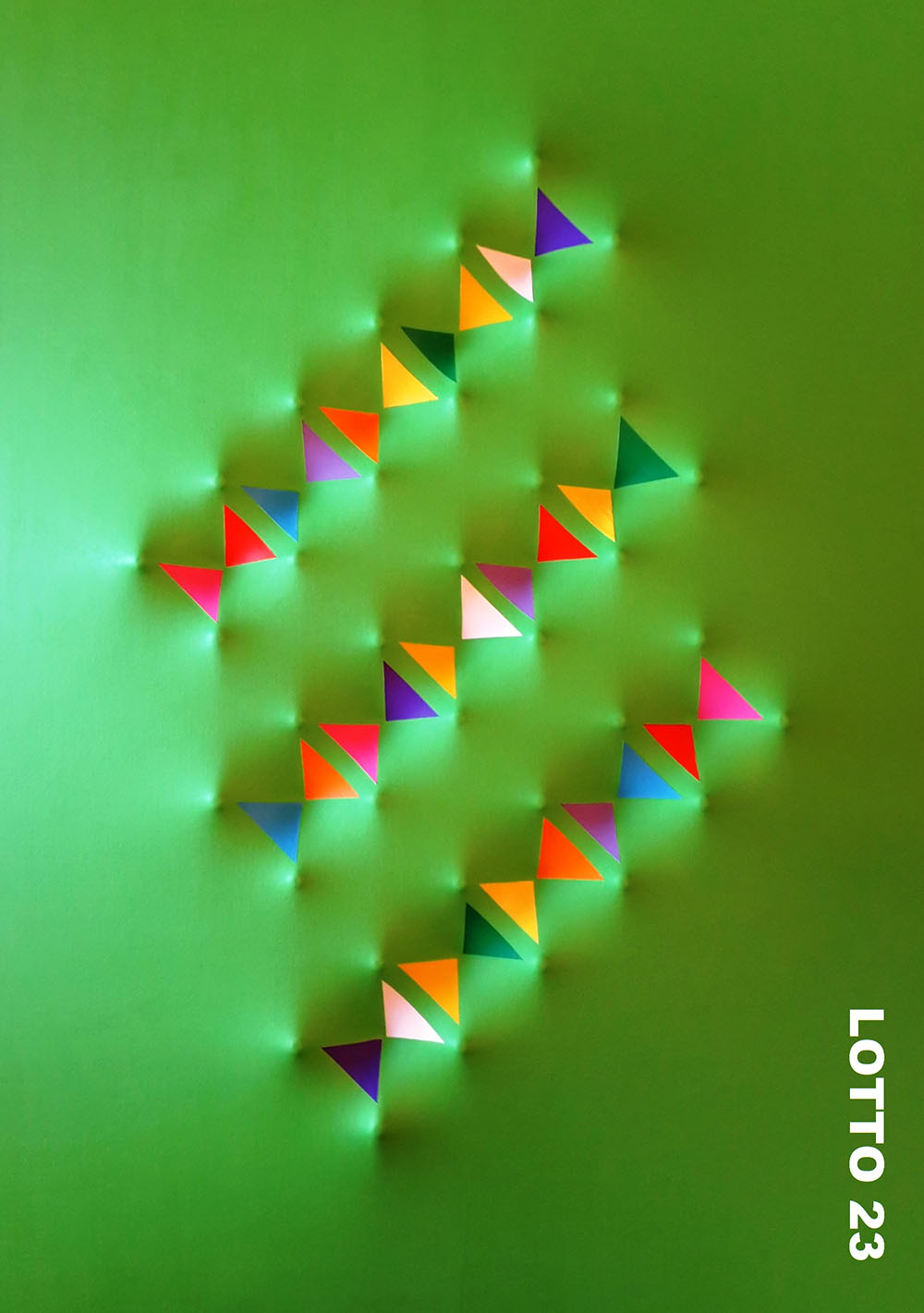 PIER PAOLO NUDI (1971) STIMA 15.000,00 * / 20.000,00 DIPINTO ACRILICO SU TELA ESTROFLESSA APPLICATA SU TAVOLA INTITOLATO “DIMENSIONE TRIANGOLARE” MIS. 70 X 50 ANNO 2016