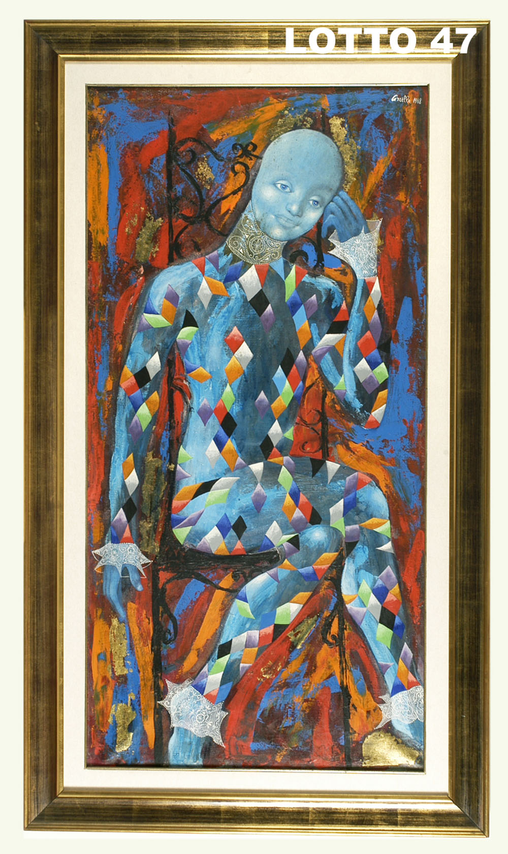 CINELLO LOSI (1928 – 1982) STIMA 4.800,00 * / 6.800,00 DIPINTO OLIO SU TELA RAFF. ARLECCHINO MIS. 120 X 60 FIRMATO E DATATO 1968 IN ALTO A DESTRA A RETRO DEDICA DELL'ARTISTA
