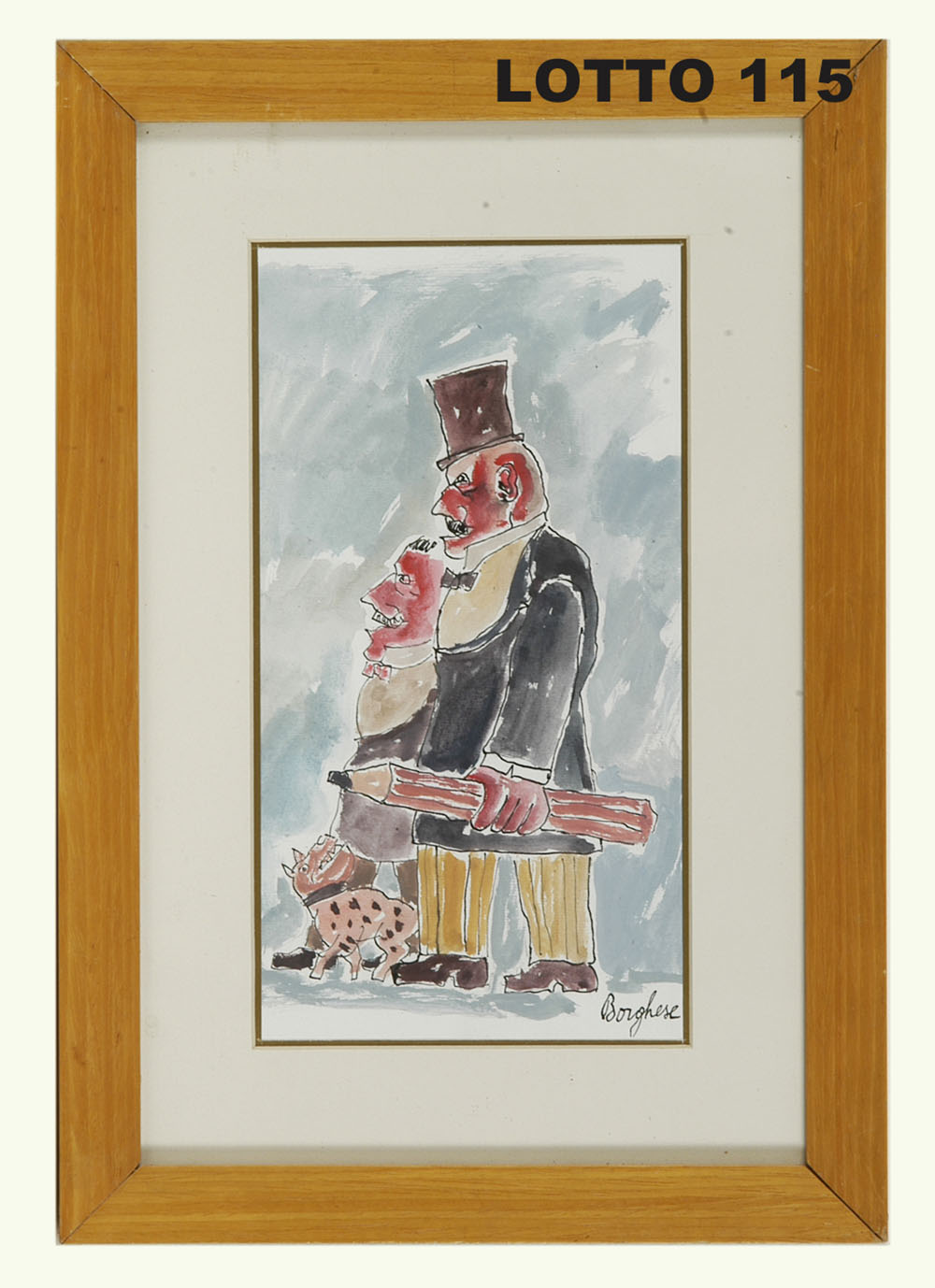 FRANZ BORGHESE (1941 – 2005) STIMA 350,00 / 700,00 DIPINTO CHINA E ACQUERELLO SU CARTA RAFF. FIGURE CON CANE MIS. 23 X 12,5 FIRMATO IN BASSO A DESTRA