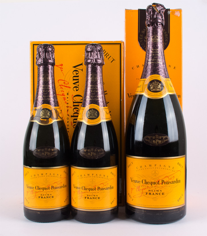 Champagne Veuve Clicquot Ponsardin ( Tot. 3 bt 0,75 lt.: 1 bt Magnum 1,5 lt. Cuvée SPB with single box, 2 bt 0,75 lt. in a double box )