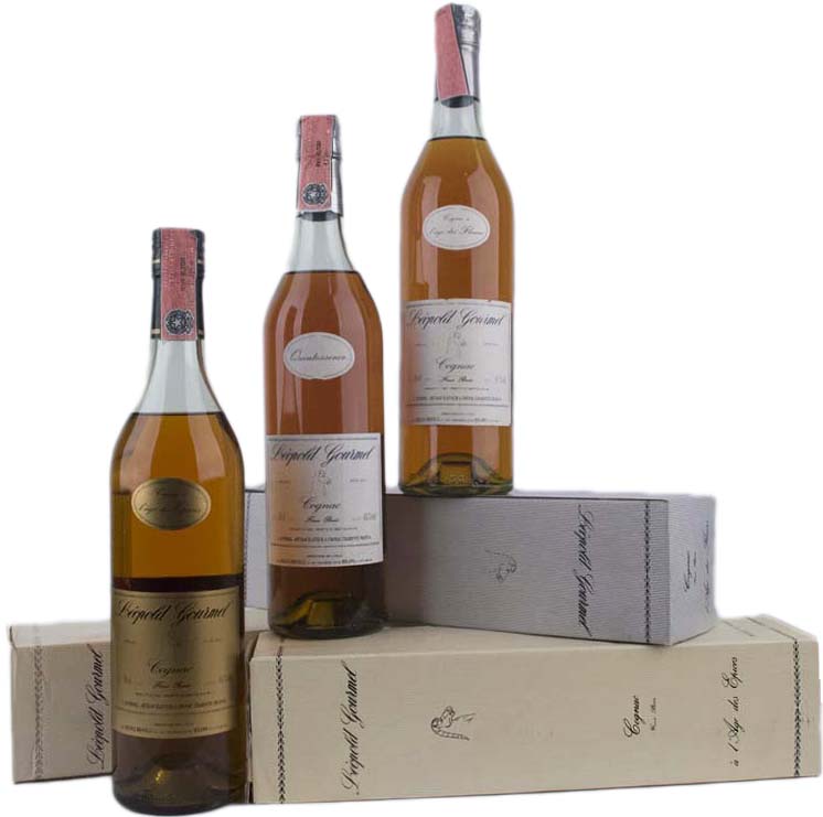 Cognac Selection Léopold Gourmel ( Tot. 3 bt 0,70 lt.: 1 bt à "L' Age des Epices", 1bt à "L'Age des fleurs", 1bt "Quintessence")