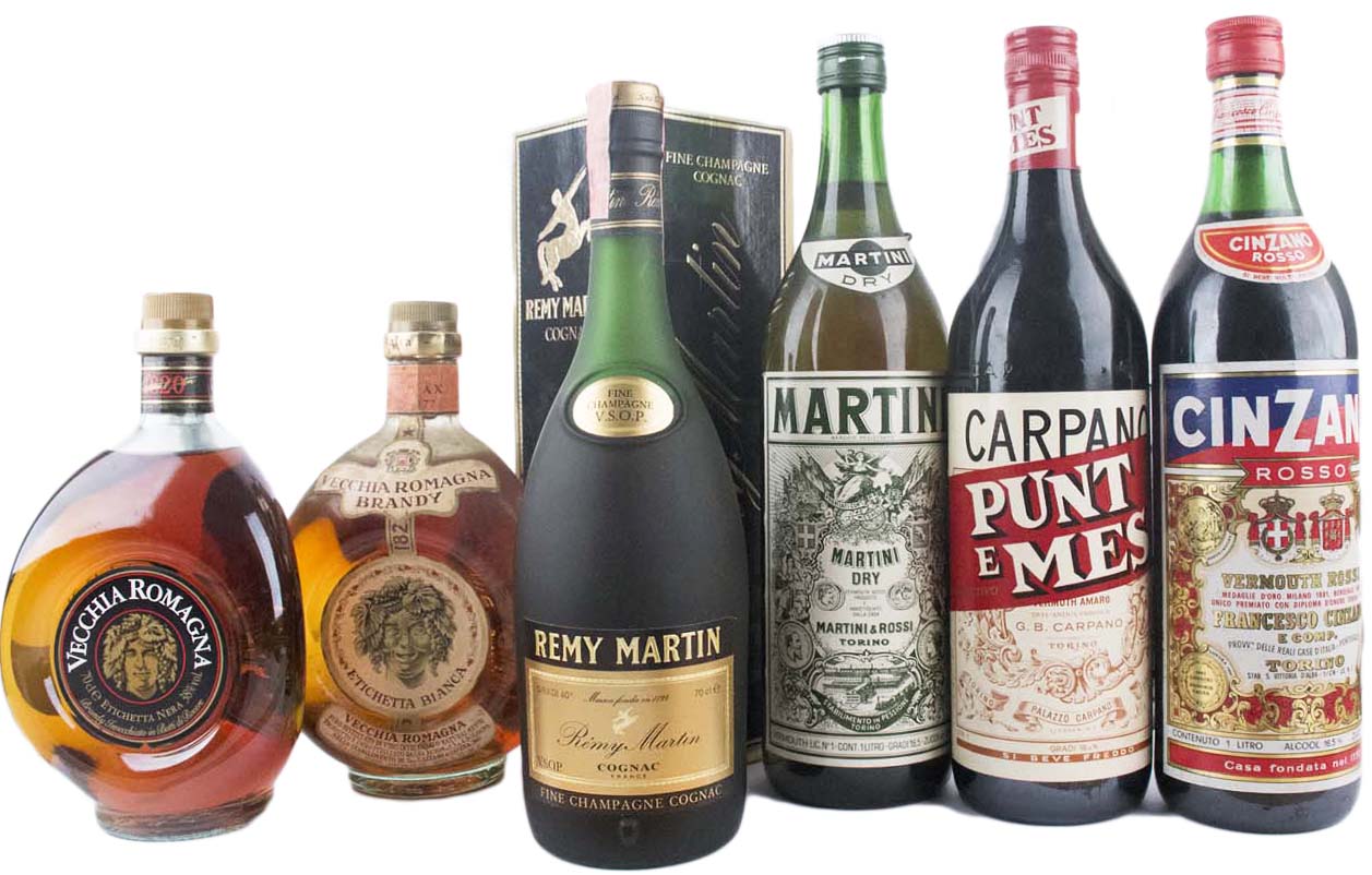 Spirits Vintage Selection ( Tot. 6 bt 0,75 lt.: 1 bt Vermouth Amaro, Carpano Punta e Mes, 1 bt Vermouth Martini Dry, Martini & Rossi, 1 bt Vermouth Rosso, Cinzano, 1 bt Vecchia Romagna Etichetta Nera, 1 bt Vecchia Romagna Etichetta Bianca, 1 bt Cognac Rémy Martin )