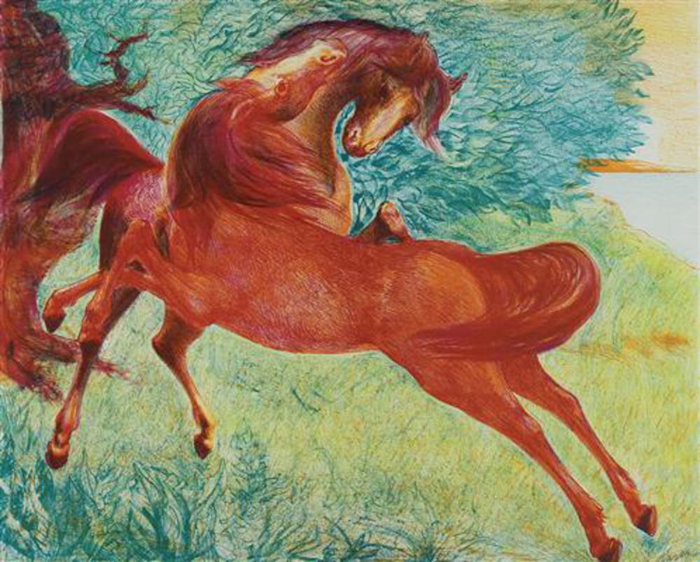 Aligi Sassu, Cavalli, litografia su carta, es. 50/110, cm. 50x60, firmato in...