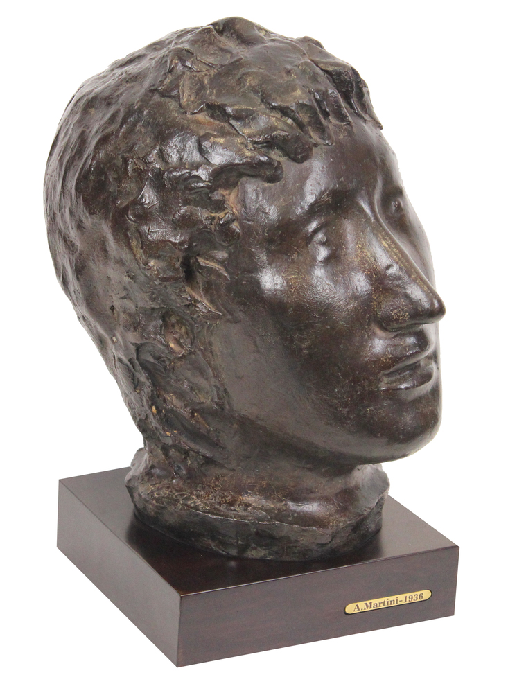 Arturo Martini, Testa di giovane, scultura in bronzo, h. cm. 35, es. 4/9, si tratta di una fusione postuma in bronzo realizzata dall'originale in gesso di Arturo Martini (1936) su autorizzazione della sig.ra Martini. La "Testa di giovane" del 1936 è stata realizzata come studio di uno dei personaggi della importante scultura "La giustizia corporativa" collocata nel 1937 al Palazzo di Giustizia di Milano, certificato di autenticità della Team Prodec di Milano, dichiarazione di autenticità e tiratura della Team Prodec di Milano con attestazione notarile