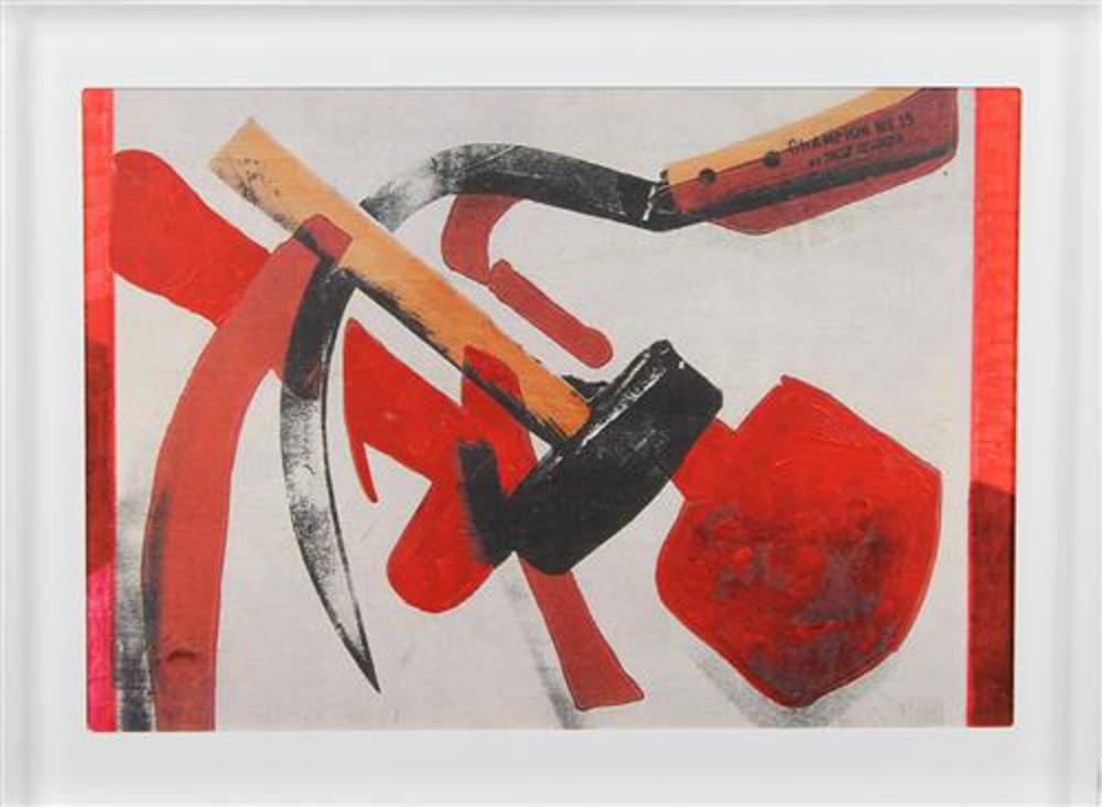Enzo Ferrari, "Simboli" da Andy Warhol, tecnica mista su tavola entro teca di plexiglass, cm. 35x50, firmata e intitolata al retro, timbro dell'Associazione Nazionale Amici de ""Il Quadrato"" al retro, certificato di autenticità dell'artista su fotografia
