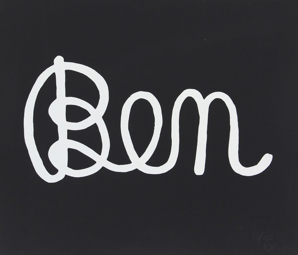 Ben Vautier, Ben, 1971, cartella contenente 10 serigrafie stampate su cartoncino murillo nero e schedario usomano, es. 13/100, cm. 60x70 ciascuna, firmate in basso a destra, timbro a secco "Artestudio di Macerata" in basso a destra, Edizioni Grafiche Artestudio di Macerata, le serigrafie sono contenute nella custodia originale