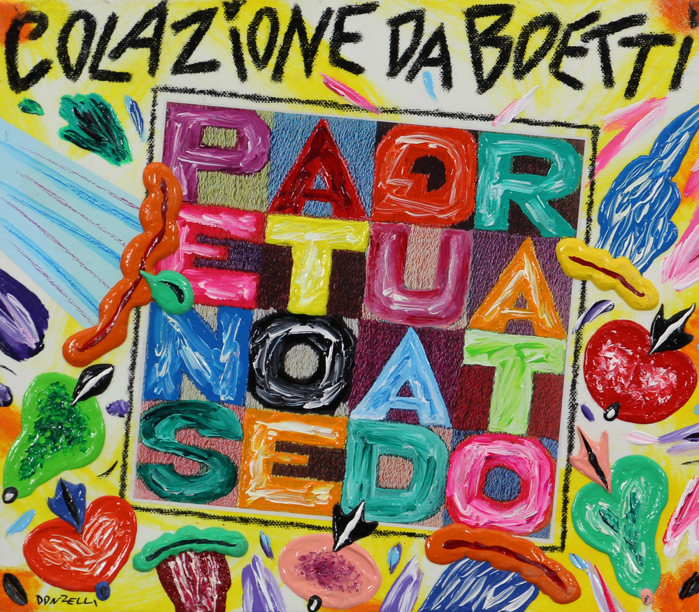 Bruno Donzelli, Colazione da Boetti, acrilico su tela, cm. 30x35, firmato in...
