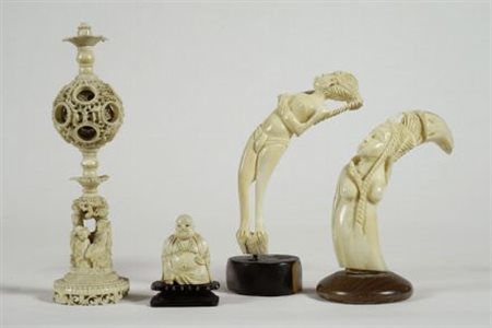 Quattro oggetti in avorio uno stand, Cina, XIX sec.; un piccolo Buddha, Cina; due figure femminili, arte africana.