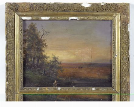Anonimo del XIX sec. PAESAGGIO CON BUOI E FIGURE Olio su tela, cm. 25,5x32 (rotture)
