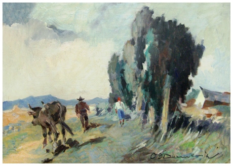 CARLO DOMENICI Livorno 1898 – Valdana di Portoferraio 1981 Campagna toscana Olio su faesite 35 x 50. Firma in b. a d.; sul verso firma e titolo + scritta “Ilaria 5 Gennaio 1973” + altra firma ignota. B.A.: 790