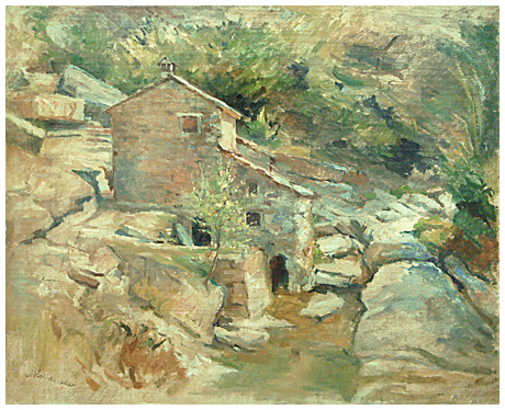 ALFONSO HOLLAENDER Ratisbona (Germania) 1845 – Firenze 1923 Paesaggio Olio su tela cartonata 32 x 41. Firma in b. a s.; sul verso timbro Galleria Cancelli, Firenze. B.A.: 500