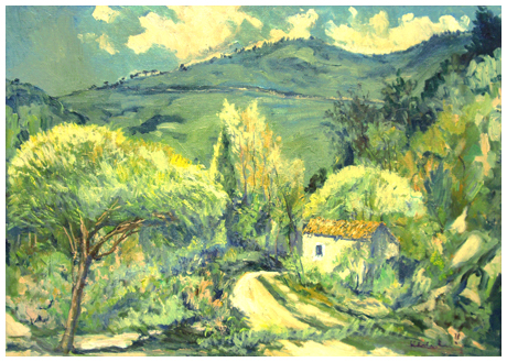AUTORE IGNOTO (elbano) Verso Monte Perone 1977 / 78 Olio su juta 50 x 70. Firma ignota (illeggibile) e data in b. a d.; sul verso titolo, scritta di autentica, firma, data,tecnica e misure. B.A.: 100