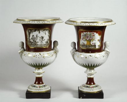Coppia di vasi di forma medicea in porcellana dipinta, prese con teste di sfingi, decorazioni floreali, Francia, XIX sec., cm. h. 44 ciascuno.