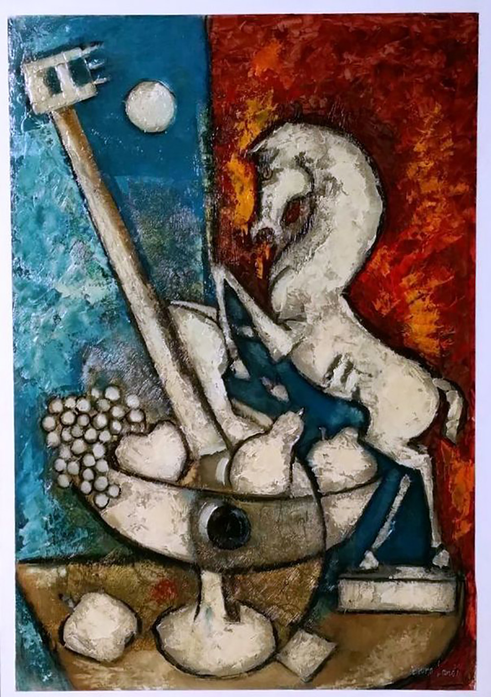 Bruno Landi "Natura morta con cavallino" - Olio e smalti su cartoncino spesso cm 66x45 - Autentica dell'artista su foto
