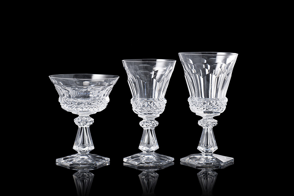 Parte di servizio di bicchieri in cristallo molato composto da undici coppe, undici bicchieri d'acqua, nove bicchieri da vino (minimi difetti) Cut-glass part stemware service (minor defects)