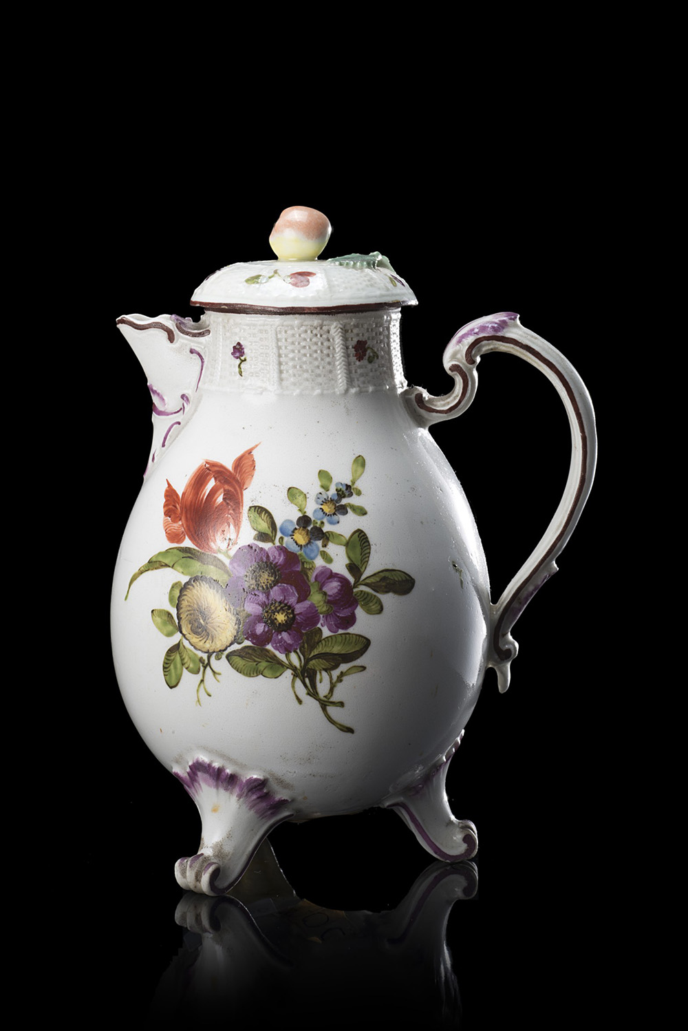 Caffettiera in porcellana con tre piedini a ricciolo e decorazione a bouquet di fiori. Profili color porpora. Manico a ricciolo. Porcellana impressa a rilievo nella pasta con motivo a vimini intrecciato sul collo e sul coperchio (h. cm 17) Ludwigsburg (?), sec. XVIII (restauri e rifacimenti) Porcelain tripod coffee pot. Ludwigsburg (?) 18th century (restorations)
