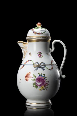 Caffettiera in porcellana a decoro floreale e profili in oro. Coperchio con...
