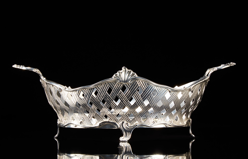 Cestino in argento a due manici, di forma ovale, con sponda traforata a fasce...