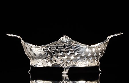 Cestino in argento a due manici, di forma ovale, con sponda traforata a fasce intrecciate, con piedini, bordura e manici decorati a volute, foglie stilizzate e fiori. Londra, 1906 (cm 34,5) (gr 740 ca.) (difetti) Silver basket London, 1906 (defects)
