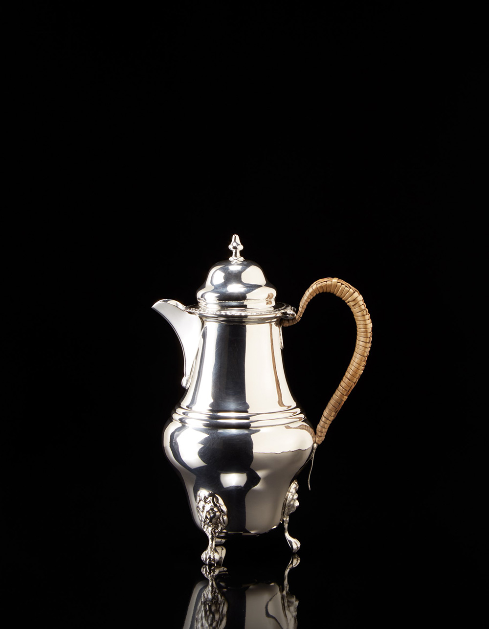Caffettiera in argento con corpo a balaustro gradinato, coperchio a cupola bombata e beccuccio lisci, piedi ferini con attacchi a testa di leone, cimatura a trottola e manico ad ansa rivestito in midollino. Londra, 1909 (h. cm 17) (gr 200 ca.) (difetti) Silver coffee pot. London, 1909 (defects)