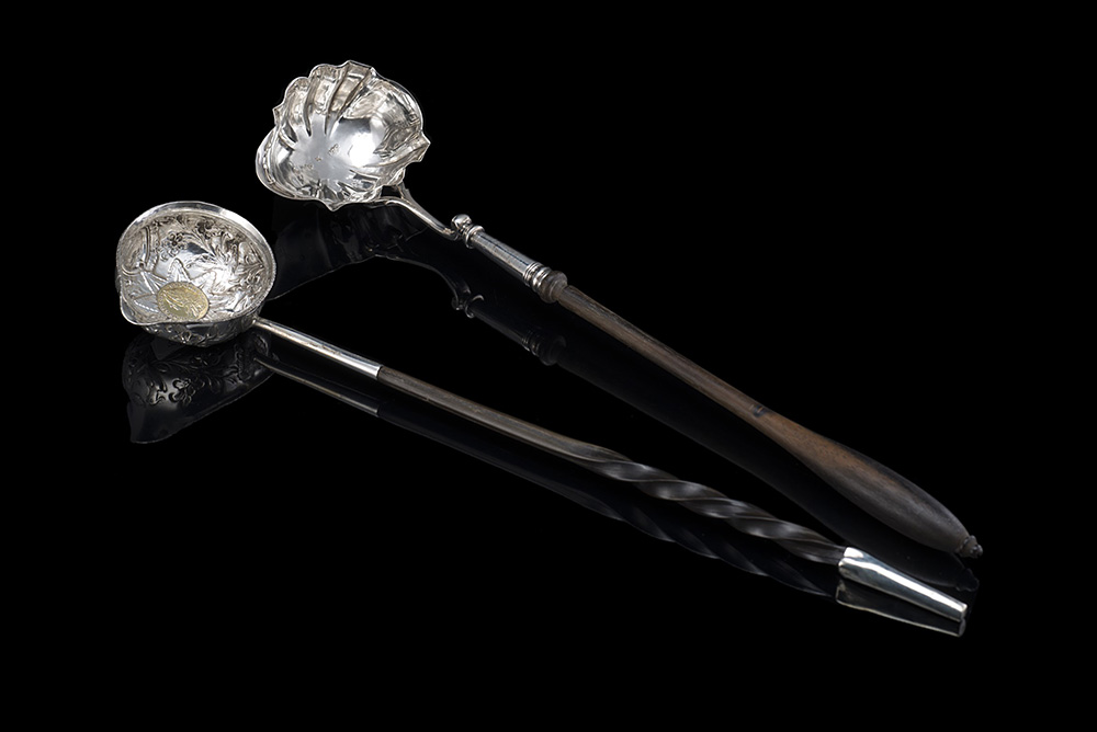 Due mestoli da punch di cui uno in argento e legno Londra 1752 e uno in...