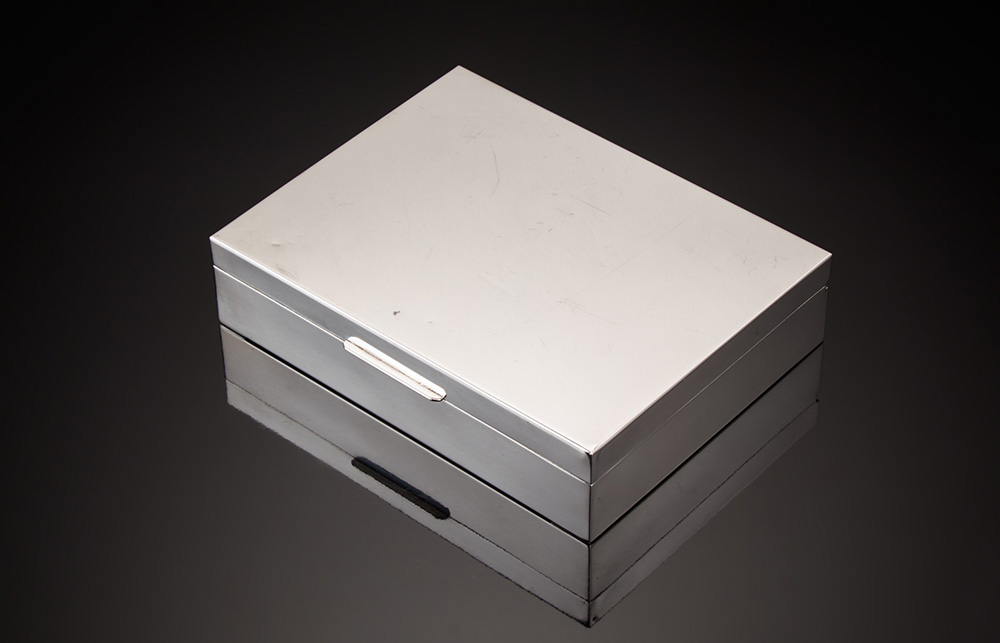 Scatola in argento e legno di forma rettangolare, liscia. Italia, sec. XX (cm 17x12) (difetti) 20th-century Italian silver and wooden rectangular box (defects)