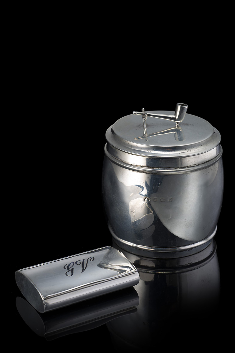 Lotto di due tabacchiere in argento, una a forma di botte. Birmingham, 1901; l'altra rettangolare con incise iniziali GV, Italia, anni 70 del sec. XX (gr 300 ca.) (difetti) Lot comprising two silver snuff-boxes. Birmingham, 1901; Italy, ë70s of the 20th century (defects)