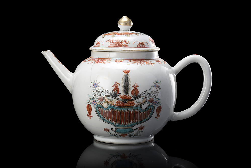 Teiera con coperchio con decorata in rosso ferro con cesto di fiori e dorature (difetti) Cina, sec. XVIII A teapot and cover with iron red and gilt decoration of basket of flowers (flaws) China, 18th century (h. 17 cm.)