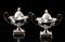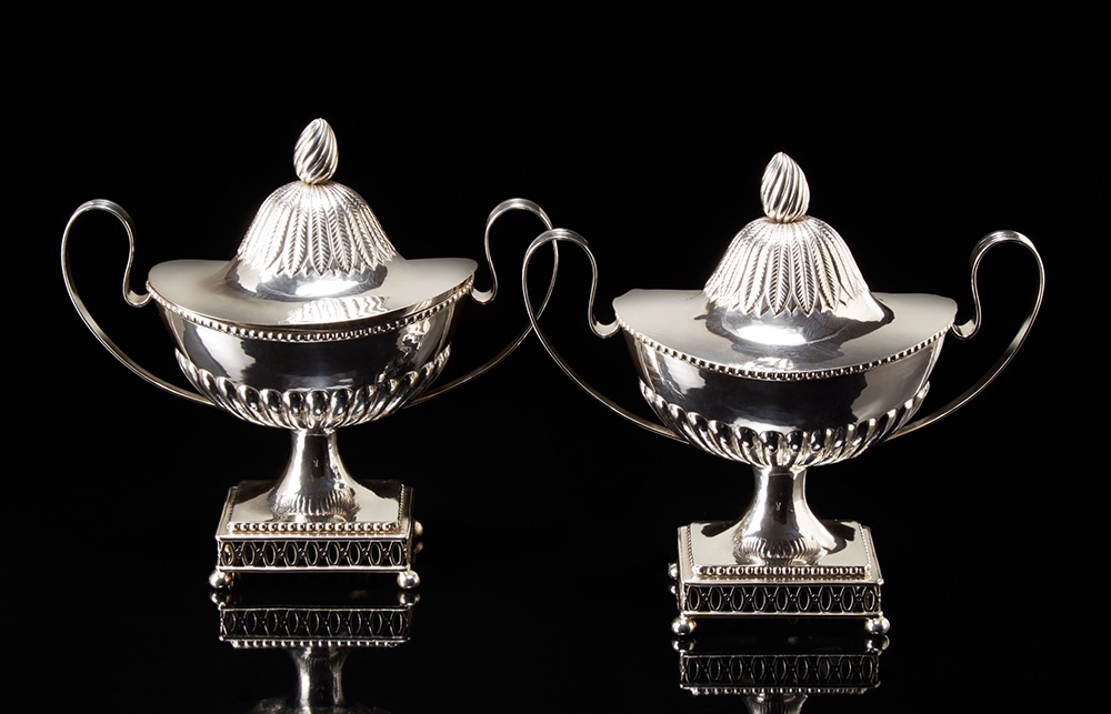 Coppia di salsiere in argento di forma ovale; parte inferiore della coppa decorata a baccellature radiali e cupola del coperchio cesellata a foglie ricadenti; fusto liscio rastremato su plinto rettangolare traforato con piedini. Profili perlinati, manici ad ansa e presa a fiammella. Olanda sec. XIX (h. cm 24) (gr 1370 ca.) (difetti) A pair of 19th-century Dutch silver sauceboats (defects)