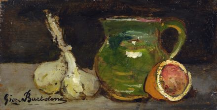Giovanni Bartolena (Livorno, 1866 - 1942) NATURA MORTA Olio su tavola, cm. 17x32,5 Firma in basso a sinistra. Sul verso: dichiarazione di autenticità di Mario Borgiotti e di Giovanni March; etichetta Raccolta B. Bardi; etichetta Gruppo labronico 22° mostra.