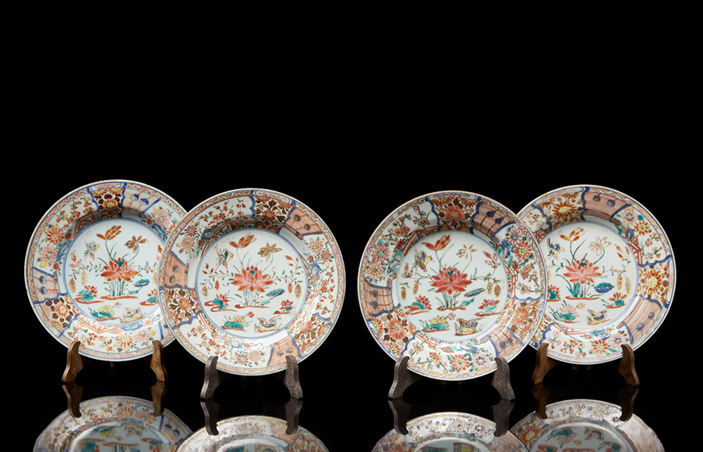 Quattro piatti in porcellana Famiglia Rosa decorati con stagno e anatre mandarine (difetti e restauri) Cina, periodo Qianlong (1736-1795) Four Famille Rose dishes with mandarin ducks (losses and restorations) China, Qianlong period (1736-1795) (diam. 23 cm.)