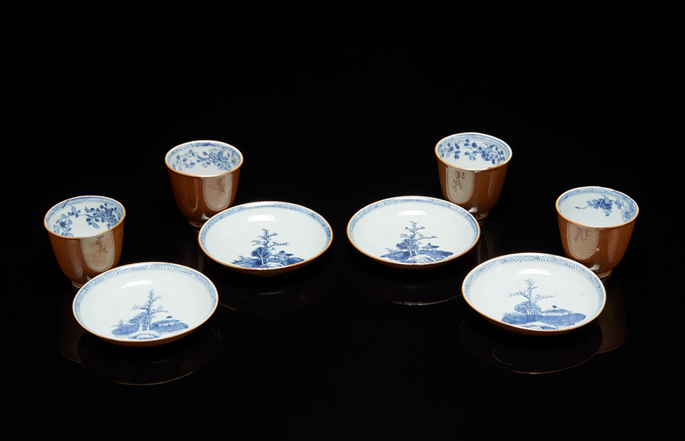Quattro tazze a campana con piattini in porcellana da esportazione, decorate in bianco e blu e cafè-au-lait (difetti) Cina, sec. XVIII Four cafè-au-lait cups with blue and white decoration (flaws) China, 18th century (diam. piatto/dish 13,5 cm.; h. tazze/cups 7,5 cm.)