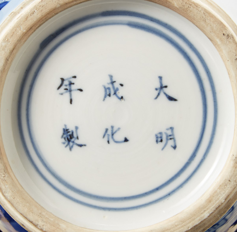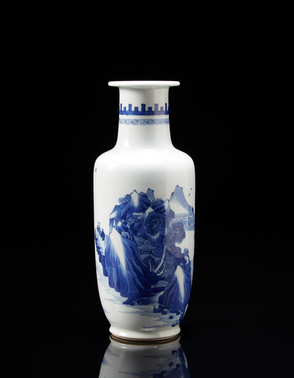Piccolo vaso rouleau in porcellana bianca e blu con scena di paesaggio, marchio apocrifo Chenghua alla base Cina, sec. XX A small blue and white rouleau vase, decorated with a landscape scene, with apocryphal Chenghua mark to the base China, 20th century (h. 29 cm.)