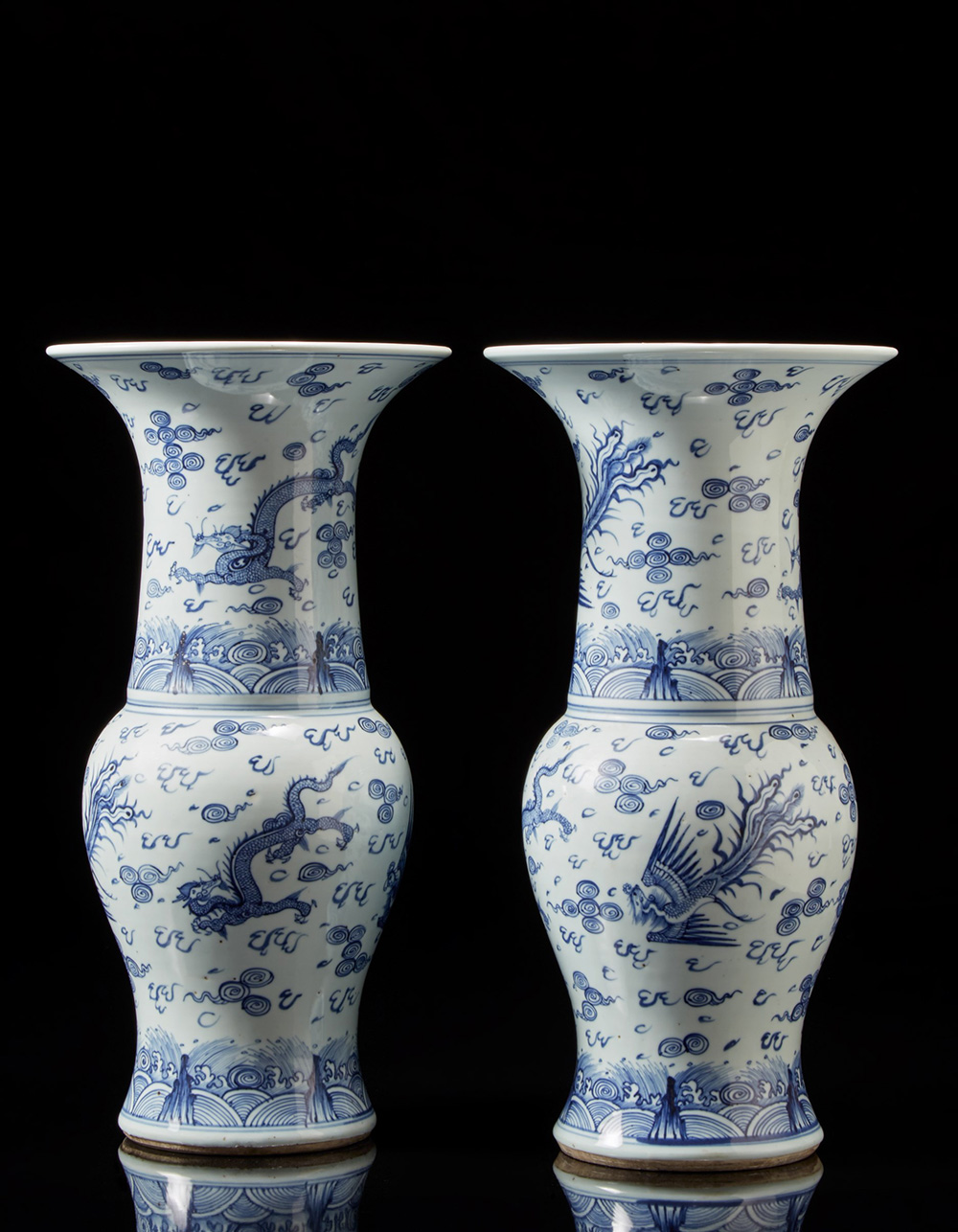 Due vasi di forma Yen-Yen con decorazione bianco blu con draghi e fenici...