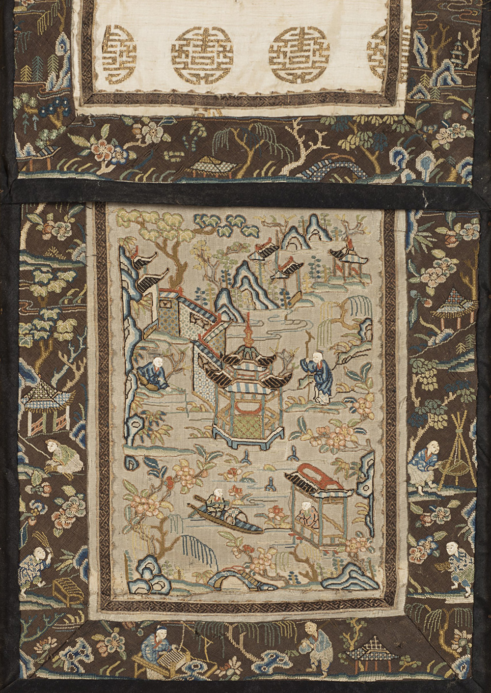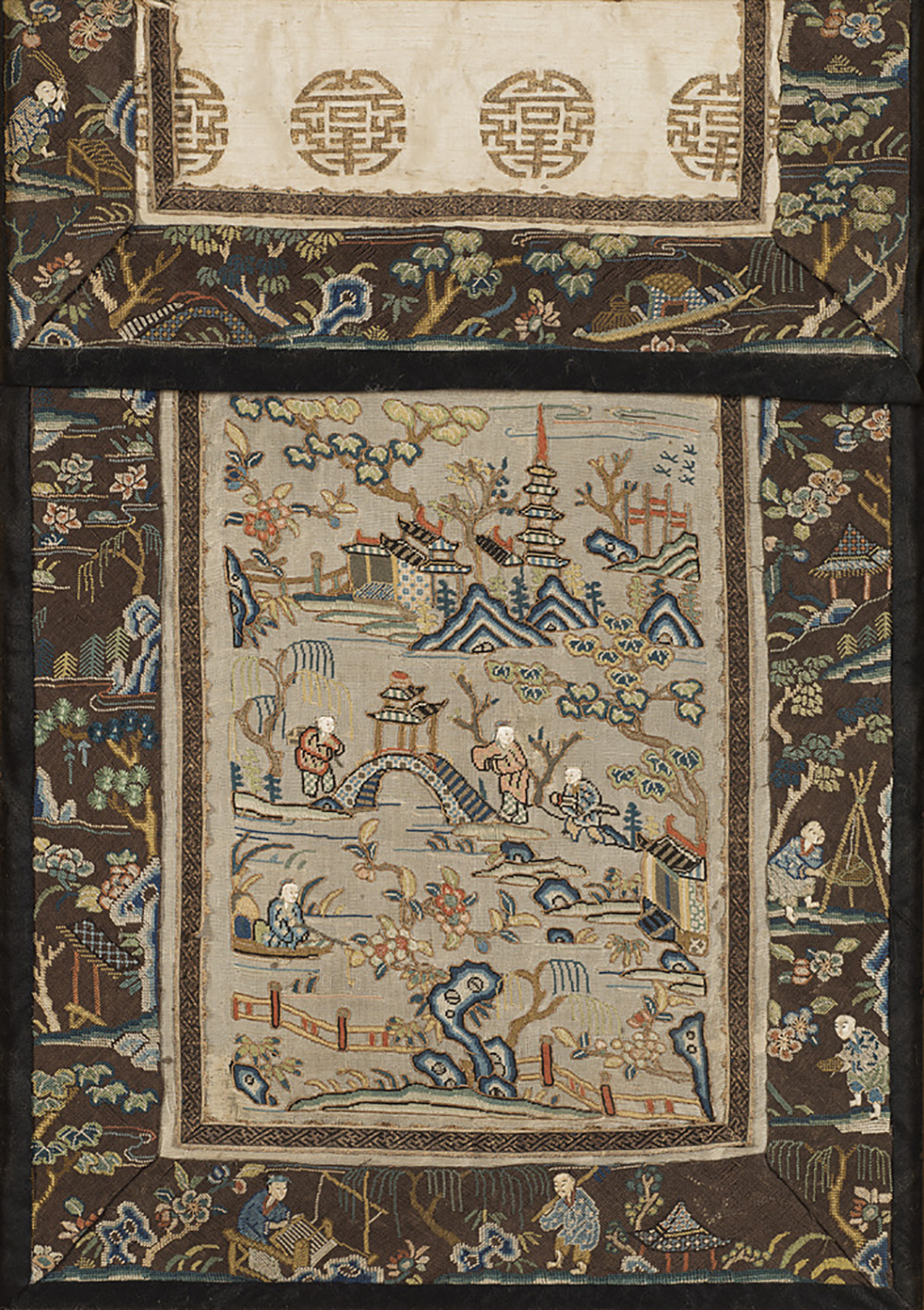 Coppia di tessuti in seta color avorio ricamati con figure in paesaggio, in cornice Cina, fine sec. XIX A pair of ivory silk embroideries decorated with figures in landscape, framed and glazed China, late 19th century (35x51 cm.)