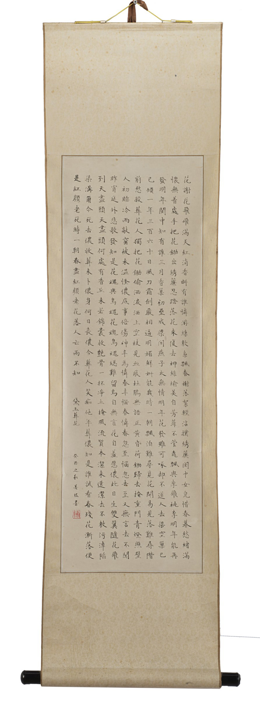 Rotolo verticale con calligrafia di un frammento del romanzo "Honglou meng", inchisotro su carta Cina, inizio sec. XX A vertical scroll with part of "Honglou meng" novel, ink and colours on paper China, first half 20th century (94x32 cm.)