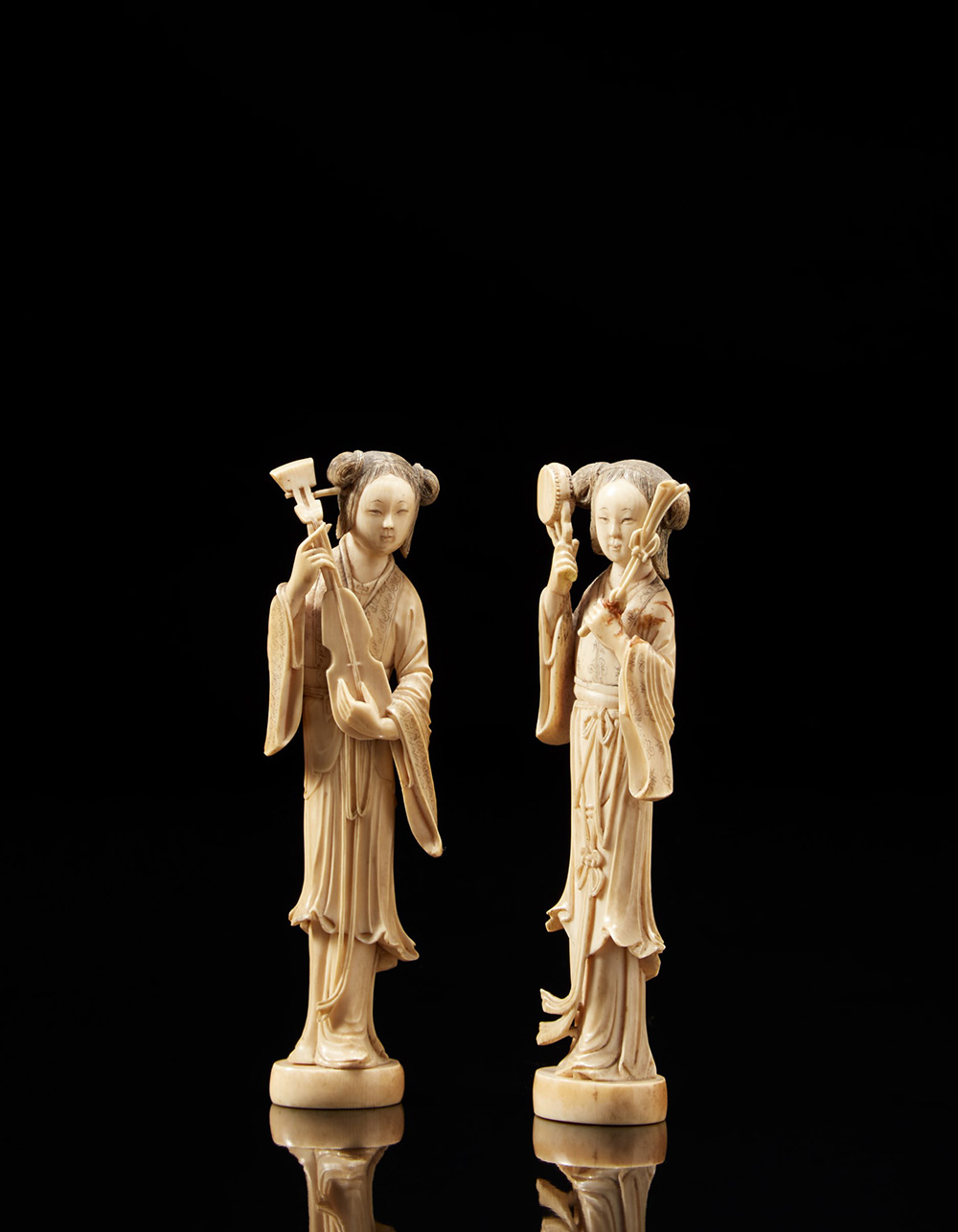 Coppia di sculture in avorio raffiguranti due dame con strumenti musicali...