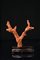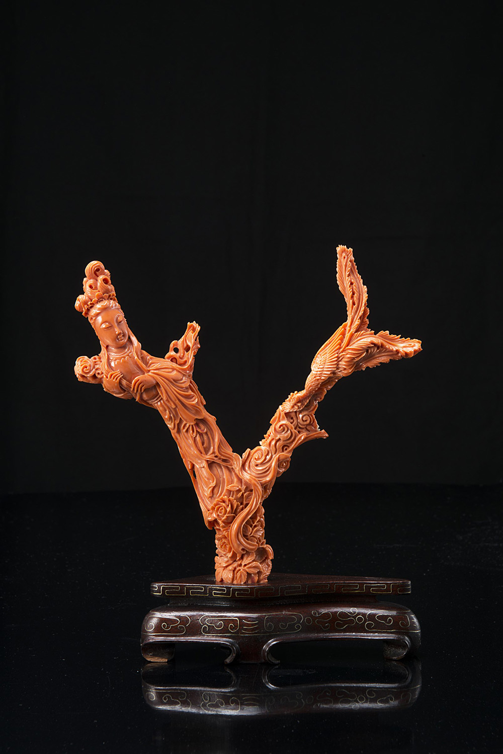 Ramo di corallo intagliato con dama e fenice, con base in legno (rotture)