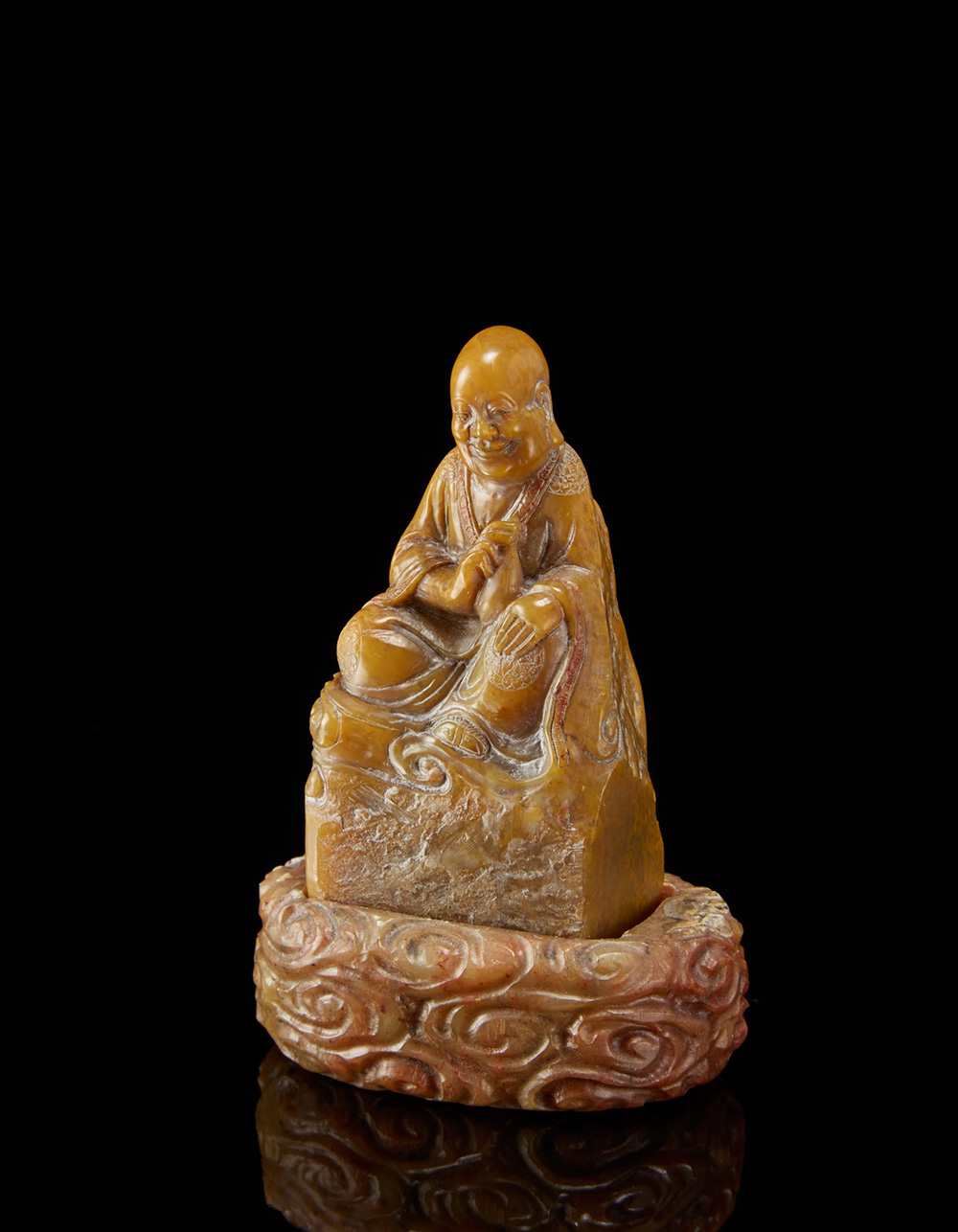 Piccola scultura in pietra saponaria raffigurante un luohan seduto con base Cina, sec. XIX A small soapstone sculpture of a seated luohan, with base China, 19th century (h. 7 cm.)