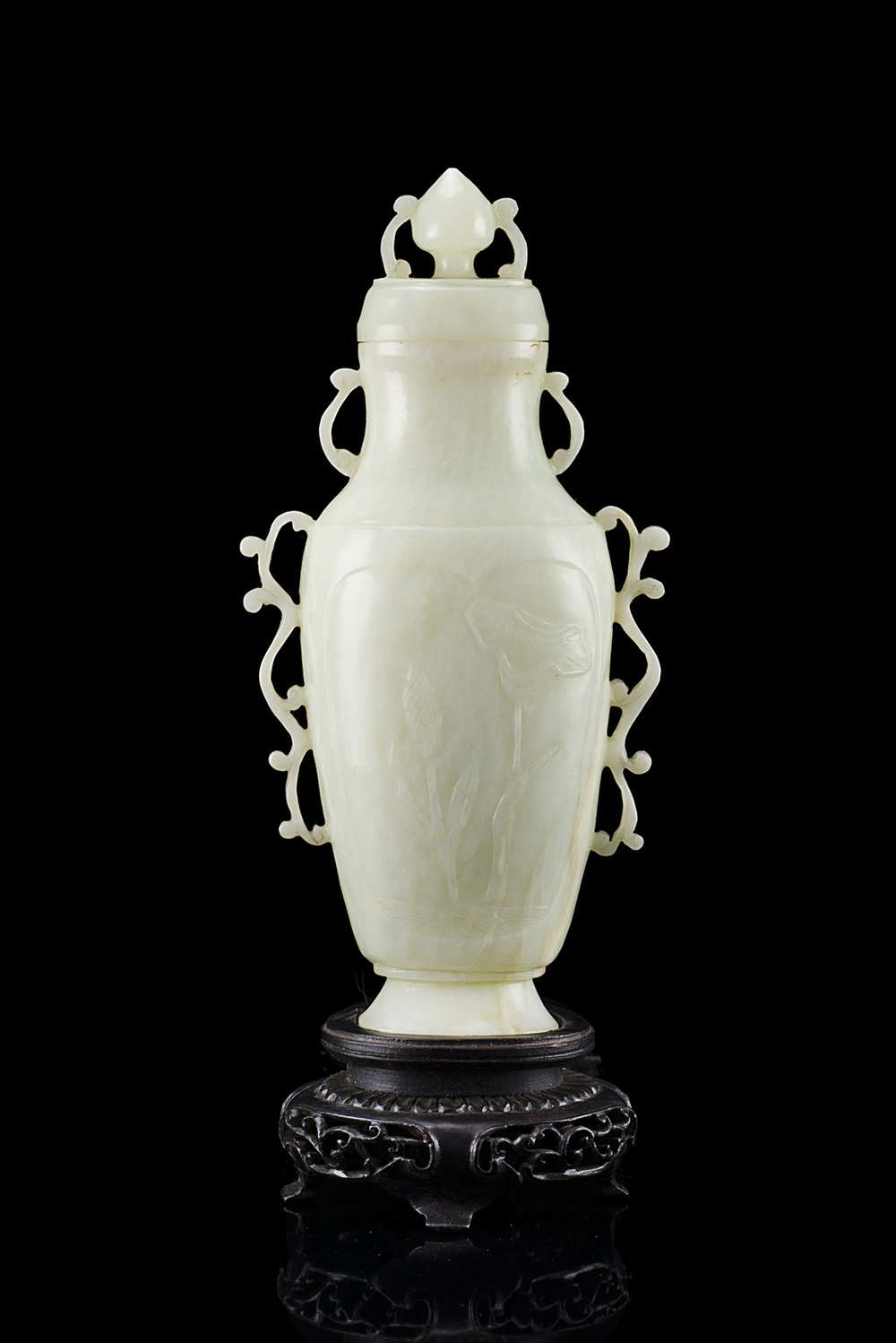 Vaso con coperchio in giada color celadon delicatamente inciso con decorazione floreale, con base in legno Cina, prima metà sec. XX Provenienza: Solza Gioiellieri Bergamo A celadon jade vase and cover with delicate incisions of flowers, with attached wood base China, first half 20th century Provenance: Solza Gioiellieri Bergamo (h. 18,5 cm.)